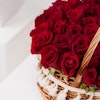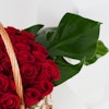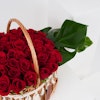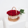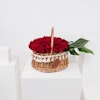 Introducing the stunning Love Basket arrangement. This captivating arrangement features 40 beautiful red roses paired with lush monstera leaves, nestled in a rustic wicker basket adorned with delicate white tassels. The perfect balance of classic elegance and modern design, this arrangement is sure to make a statement in any room.