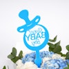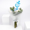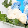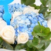 - A lovely bouquet that's arranged with blue hydrangeas, white roses, eucylyptus & Sweet Baby Boy topper.