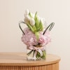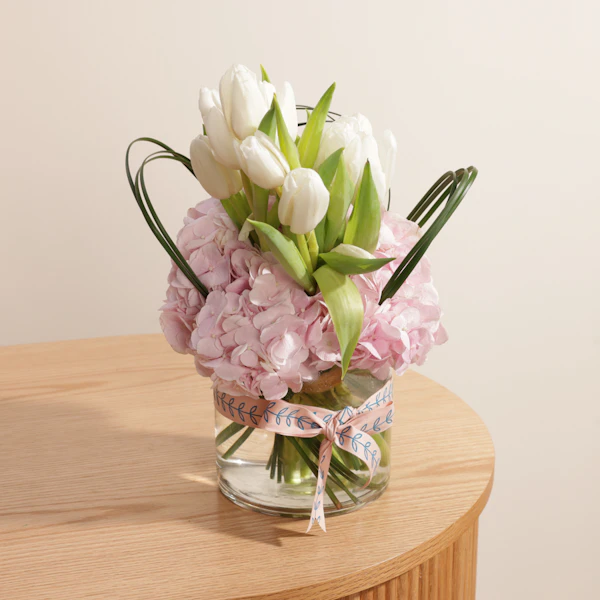 Adorn any setting with the enchanting beauty of a glass vase filled with delicate pink hydrangeas and elegant white tulips. The soft, pastel hues of the pink hydrangeas radiate charm and grace, while the pristine white tulips symbolize purity and new beginnings. Together, they create a stunning floral arrangement that exudes sophistication and tranquility. Perfect for celebrating special occasions, expressing heartfelt sentiments, or simply adding a touch of natural elegance to any space, this gift is sure to delight and captivate.