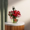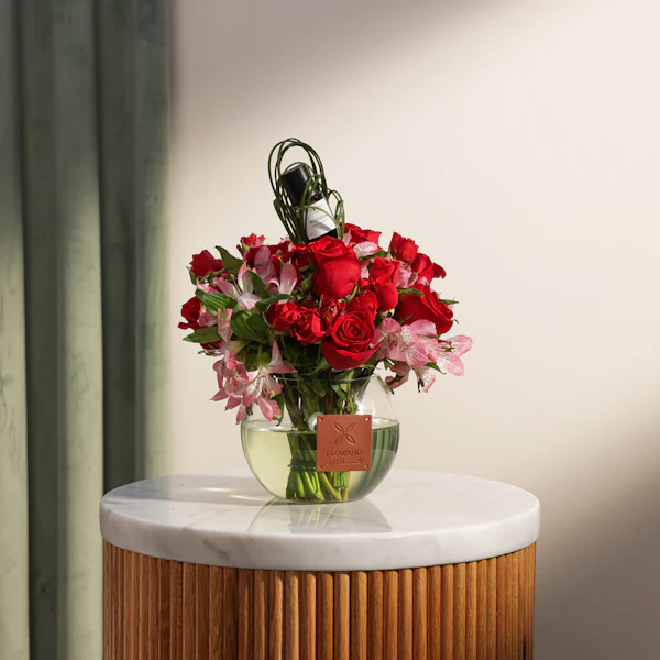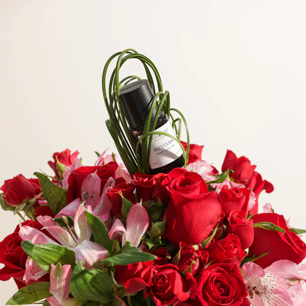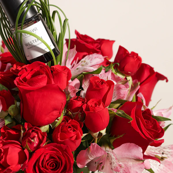A fusion of elegance and fragrance awaits with this exquisite gift ensemble. Featuring a 15ml Mubkhar Western Perfume, known for its captivating scent, accompanied by a vibrant arrangement of Red Baby Roses, Red Roses, and Pink Alstroemeria in a Glass Fishbowl, totaling 20 flowers. This gift transcends ordinary gifting, blending the allure of fine perfume with the timeless beauty of fresh flowers. Its impact is profound, leaving recipients immersed in a sensory experience that evokes admiration and appreciation. Each element, from the delicate blooms to the enchanting fragrance, creates a lasting impression, making it a cherished symbol of affection and sophistication.