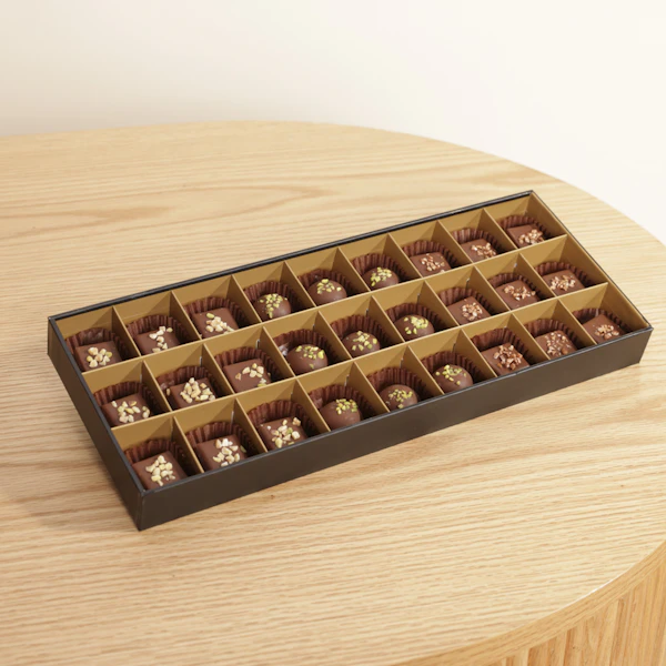 SKU FC37007Delight in the luxurious flavors of the Abucci Big Chocolate Box, a perfect gift for chocolate lovers. This exquisite box includes the rich Pistachio Hill flavor, the indulgent Pecan Mekhramel with Date Molasse, and the irresistible Layali Lebanon, a blend of rose water with pistachios and almonds. Each bite offers a unique taste experience, crafted with premium ingredients to satisfy even the most refined palate. Whether for sharing with loved ones or as a gift for someone special, this chocolate box is a true indulgence. Buy now and savor the delicious flavors of Abucci's finest chocolates!