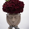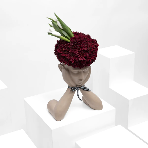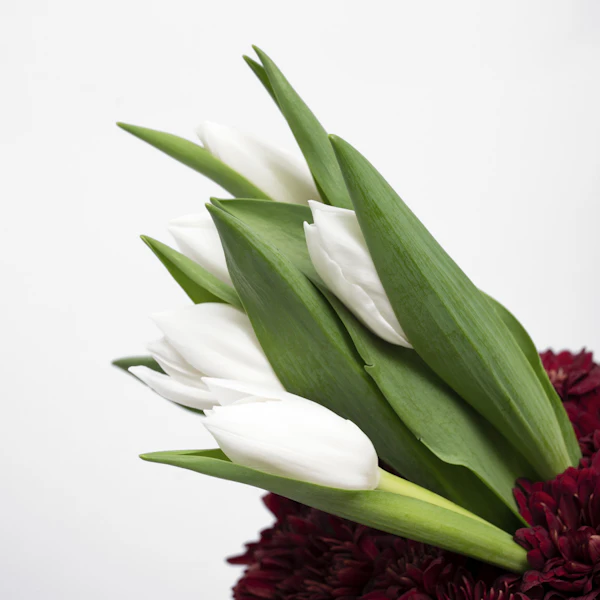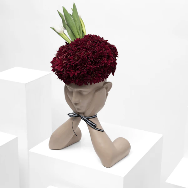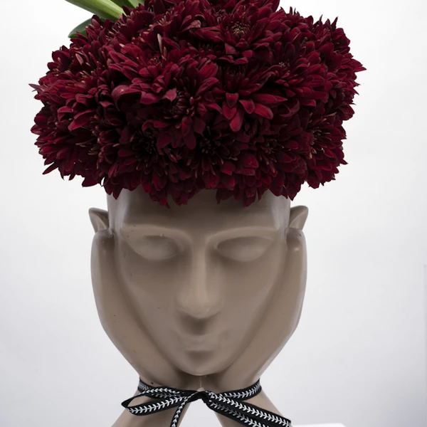 - A special artistic sculpture that's arranged with a collection of red chrysanthemums & white tulips.