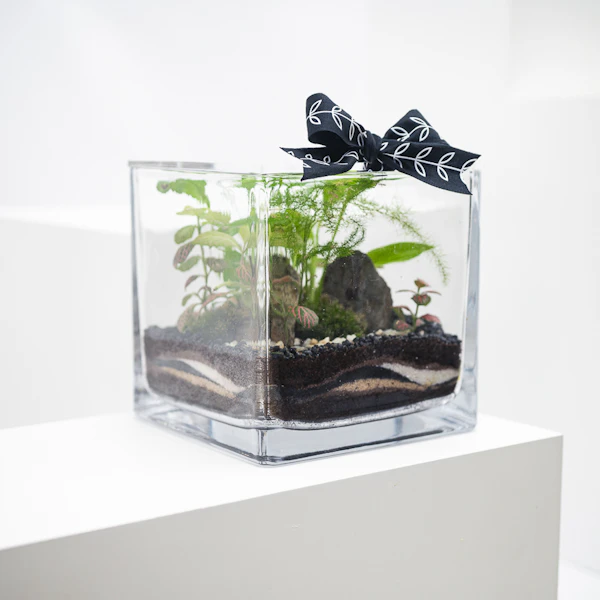 - A glass square vase that's decorated with stones, It is arranged with pink fittonia, peace lily, asparagus fern & ball moss.
