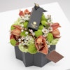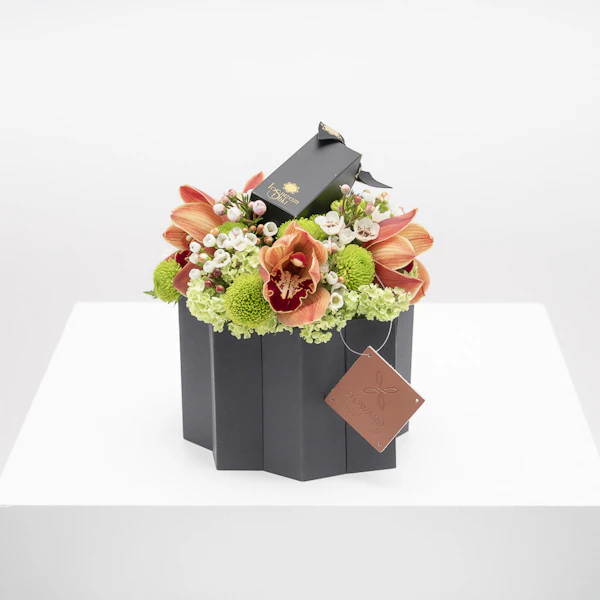 • A sweet flower arrangement of orange cymbidium, green chrysanthemums, green viburnum & white wax flowers.