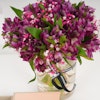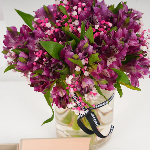 - A cylinder glass vase that's arranged with purple alstroemeria & pink gypsophila.