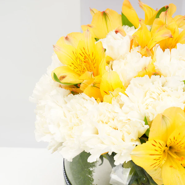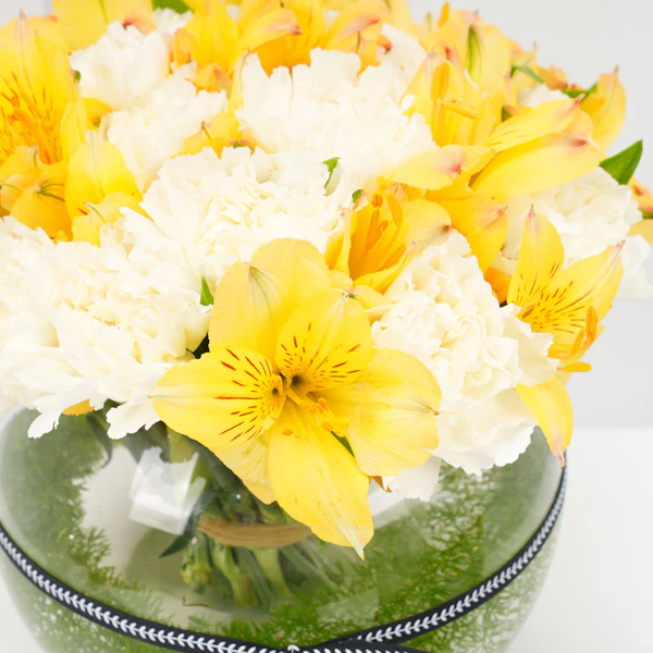 A glass bowl vase that's arranged in white carnations & yellow alstroemeria.