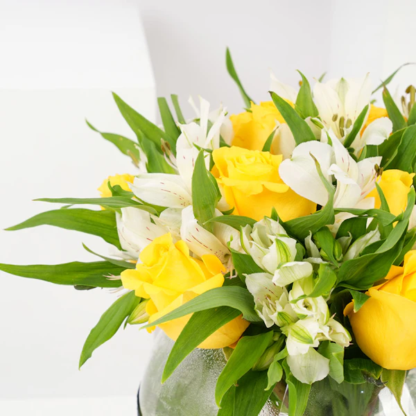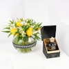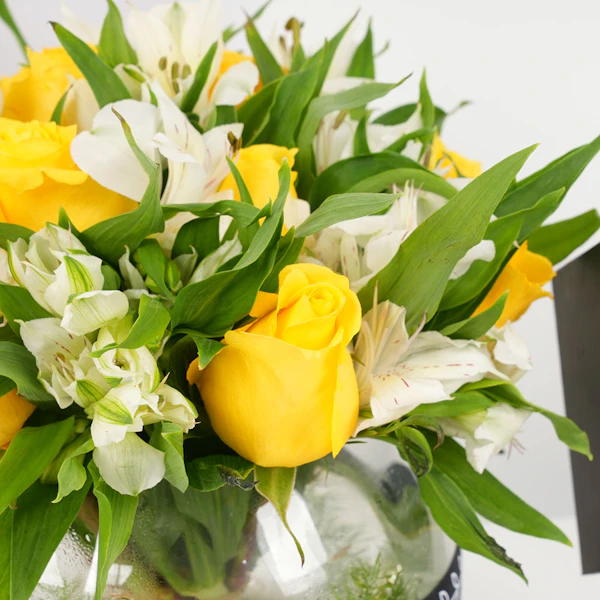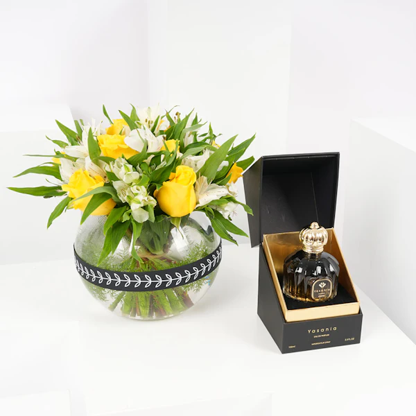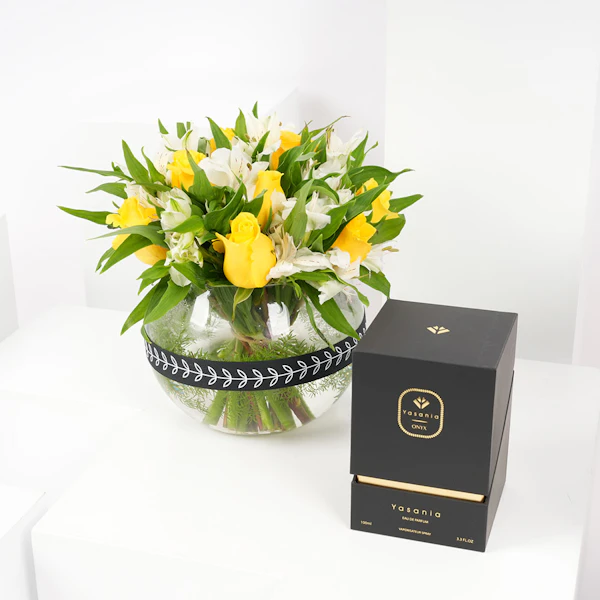 Embrace the essence of love with Yasania Onyx perfume, a mesmerizing fragrance that ignites passion. Paired with a bouquet of pure white roses in an elegant cylinder glass vase with "I love you" written on it. This gift exudes elegance and sincerity, creating a timeless and unforgettable expression of your affection.