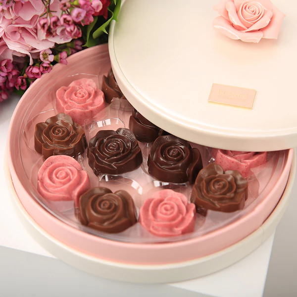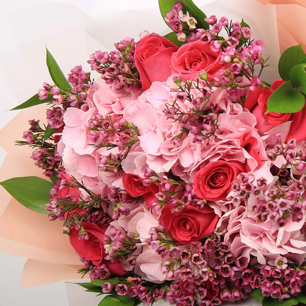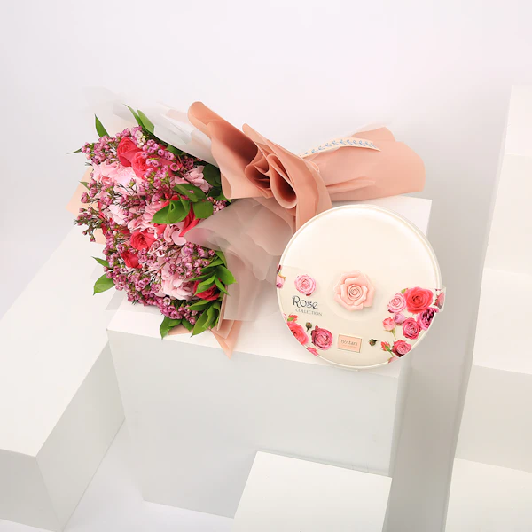 a bouquet contains hydrangea and Rose with Bostani Chocolate