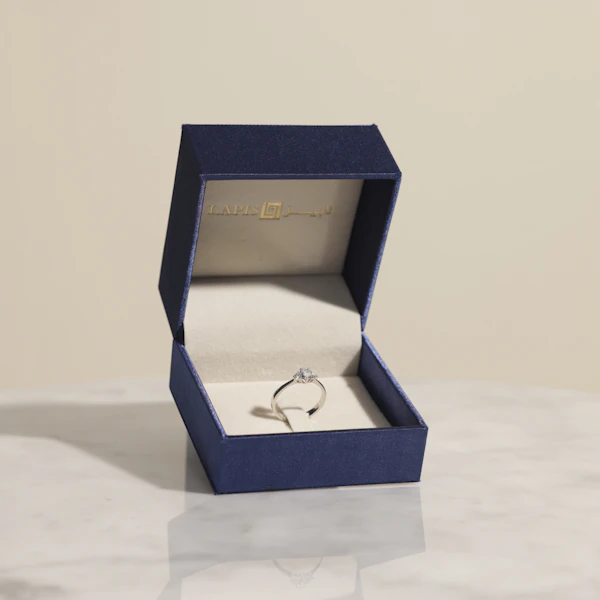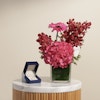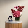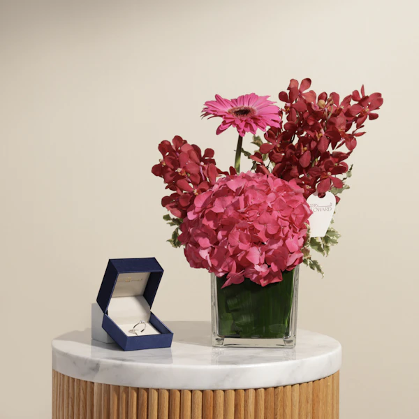Be unique with your gift and enchant her with Lapis's Trio of Pear Diamond Ring—a masterpiece of timeless elegance and contemporary allure. This classic ring boasts a trio of natural diamonds, each exuding its own unique brilliance and charm. Meticulously crafted to perfection, it effortlessly combines traditional sophistication with modern design. Presented with grace and style, the solitaire ring is accompanied by a captivating arrangement of fuchsia flowers in an exquisite glass vase, adding an extra touch of luxury to this already enchanting gift. Let this stunning piece adorn her hand and her heart, symbolizing your enduring love and admiration.