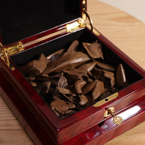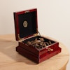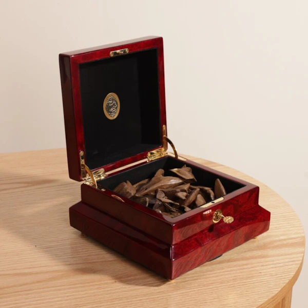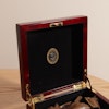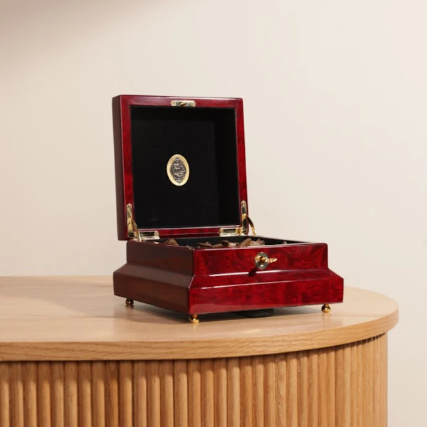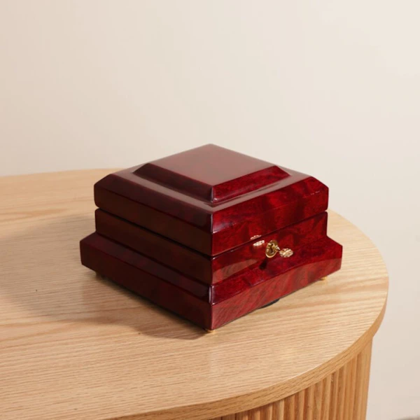 SKU FC76434Flawlessly crafted from wood, this exquisite gift box boasts a rich burgundy hue and is lined with sumptuous black velvet. Its opulent gold accents add a touch of sophistication and allure, while the elegant lock enhances its luxurious appeal. Whether for a special occasion or everyday elegance, this box exudes timeless class and charm, elevating any event or space with its impeccable craftsmanship and elegant design.