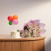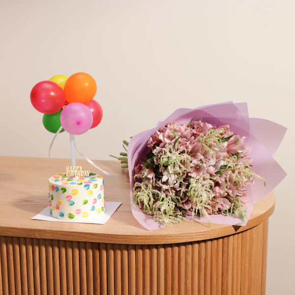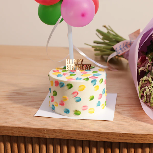 Celebrate with the Sweet Atelier Small Birthday Cake and a beautiful flowers bouquet. This delightful combination offers a charming cake to mark the occasion and a vibrant floral arrangement to brighten the day. Together, they create a memorable and joyful celebration, perfect for making any birthday extra special.