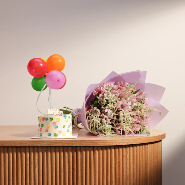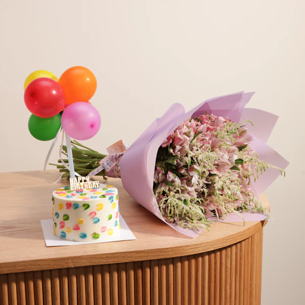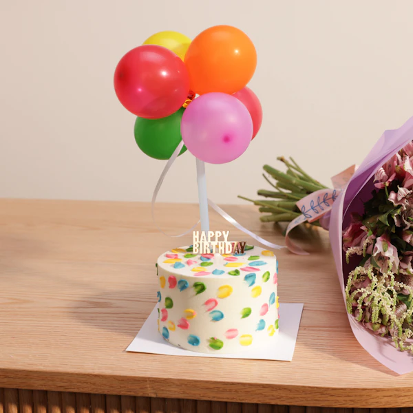 SKU FC99169Celebrate with the Sweet Atelier Small Birthday Cake and a beautiful flowers bouquet. This delightful combination offers a charming cake to mark the occasion and a vibrant floral arrangement to brighten the day. Together, they create a memorable and joyful celebration, perfect for making any birthday extra special.