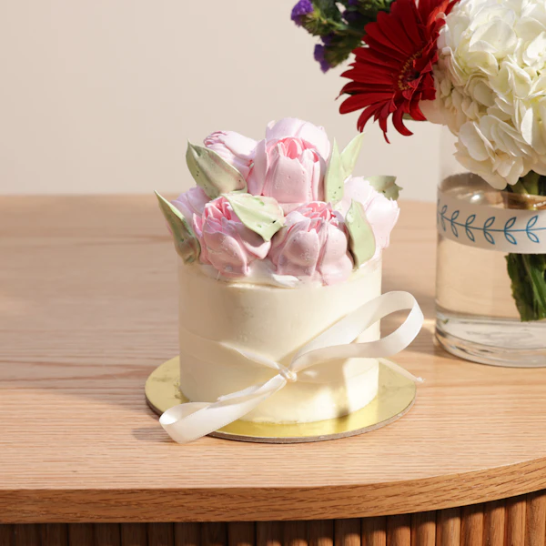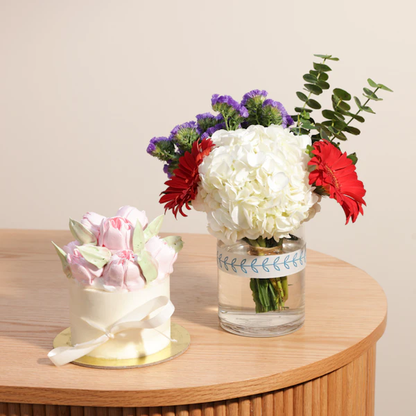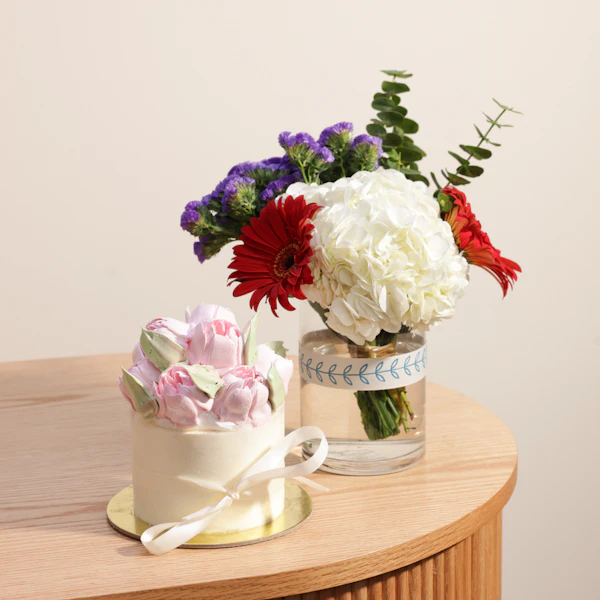 The Sweet Atelier Flowers Small Cake and Flowers Vase gift offers a delightful blend of culinary art and floral beauty. Perfect for any occasion, it combines a delicious small cake with flavors like vanilla and strawberry, paired elegantly with a vase of fresh, vibrant flowers to brighten someone's day with sweetness and charm.