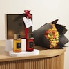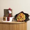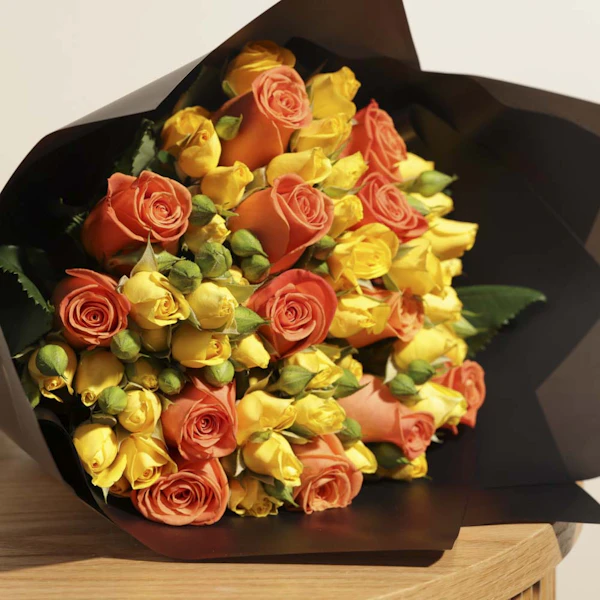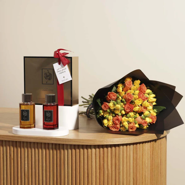 Indulge in the luxurious scent of Ibraheem Al-Qurashi, accompanied by a delightful bouquet of Orange and Yellow Baby Roses.
