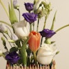 Celebrate a fresh start with a thoughtful and vibrant gift set. This Back to School Topper combines a collection of 48 Wooden Colors, perfect for inspiring creativity and artistic expression, with a stunning floral arrangement in a sleek square glass vase. The bouquet features a harmonious mix of white roses, purple eustomas, and orange tulips, creating a lively and elegant display. Ideal for brightening up a study space or making the return to school extra special, this gift set seamlessly blends practical tools with a touch of floral charm.
