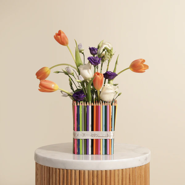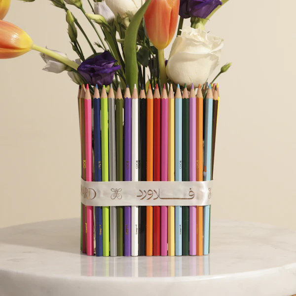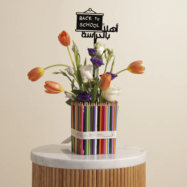 SAR241Celebrate a fresh start with a thoughtful and vibrant gift set. This Back to School Topper combines a collection of 48 Wooden Colors, perfect for inspiring creativity and artistic expression, with a stunning floral arrangement in a sleek square glass vase. The bouquet features a harmonious mix of white roses, purple eustomas, and orange tulips, creating a lively and elegant display. Ideal for brightening up a study space or making the return to school extra special, this gift set seamlessly blends practical tools with a touch of floral charm.