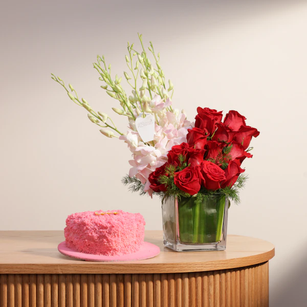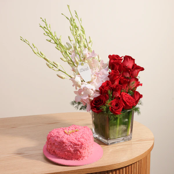 Delight in the Sweet Atelier Love Cake, filled with luscious strawberry and vanilla. Paired with a vase of flowers of your choice, this gift is perfect for celebrating love and special moments.