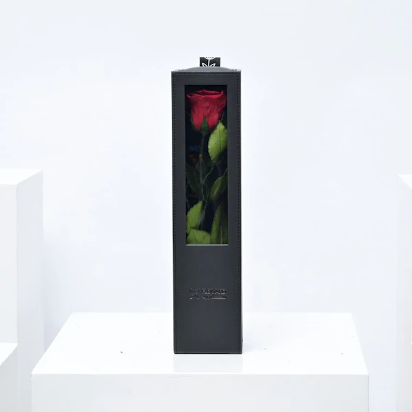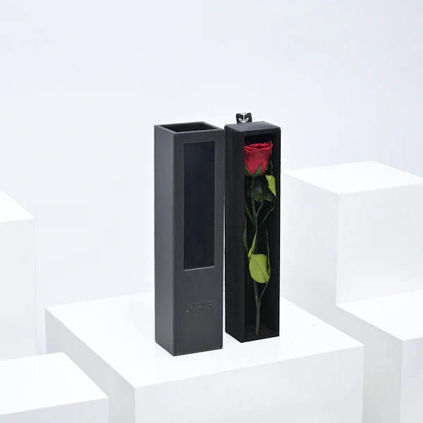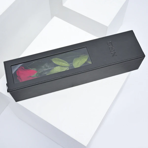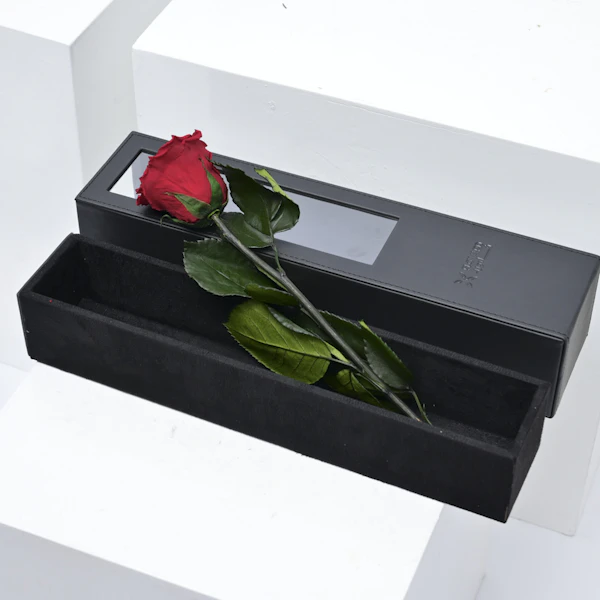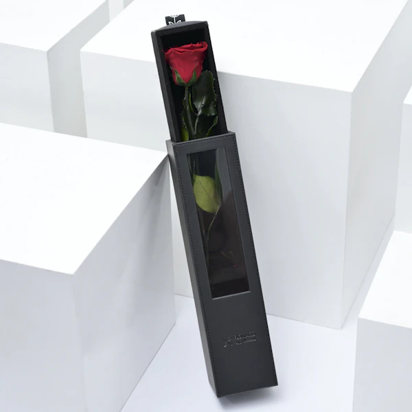 The long-lasting red rose in a premium leather black box is a luxurious and romantic symbol of love that endures through time. The deep red color of the rose represents true love, making it the perfect gift for special occasions. The rose, known for its long-lasting qualities, serves as a constant reminder of your devotion. The premium leather black box adds a touch of elegance and sophistication, making the gift a memorable gesture. The sleek and modern design of the box, paired with the timeless beauty of the rose, creates a captivating visual experience. It's a gift that will be treasured for years to come.