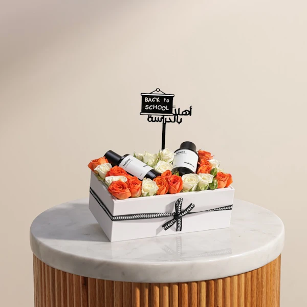 This thoughtful gift set includes Mubkhar Leather Perfume and Mubkhar Turabe Perfume, EDP each in a 50ml bottle and designed for unisex appeal. The luxurious leather fragrance combines with the distinctive Turabe scent to offer a sophisticated olfactory experience. Accompanied by a charming arrangement of white baby roses and orange baby roses, and topped with a playful back to school topper, this set combines elegance with a touch of whimsy, making it a unique and memorable gift for any occasion Order now to enjoy these exquisite gift and brighten your loved ones' day.