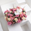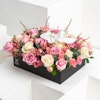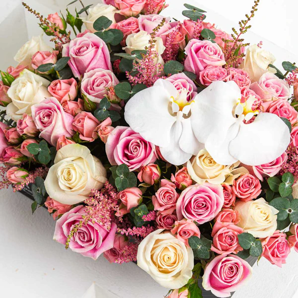 This arrangement contains Roses, Baby Roses and Orchid.