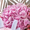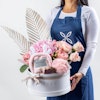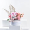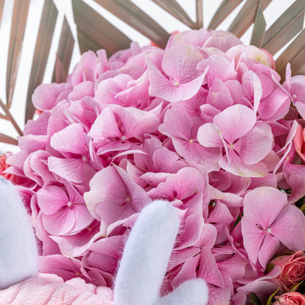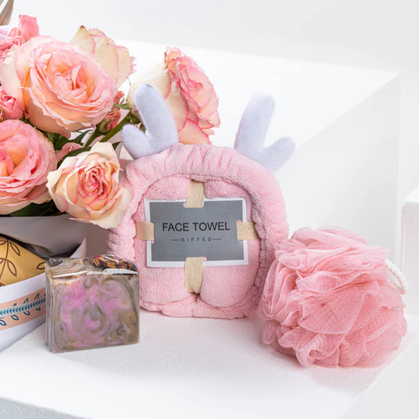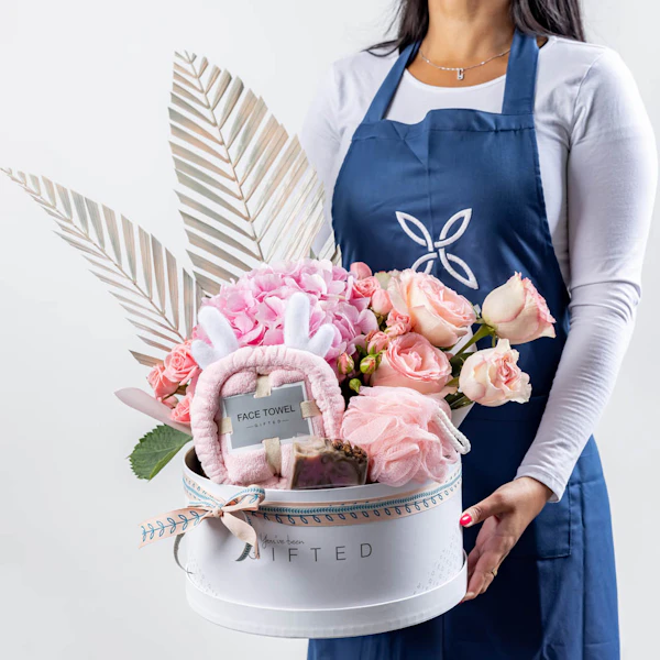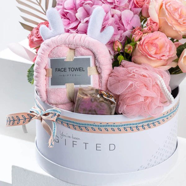 A charming basket filled with pink hydrangea, pink roses, and dainty pink baby roses, accented by delicate rose gold leaves. Paired with Gifted's pink face towel, hair band, loofah, and handmade natural soap for a delightful and thoughtful gift.