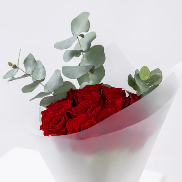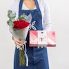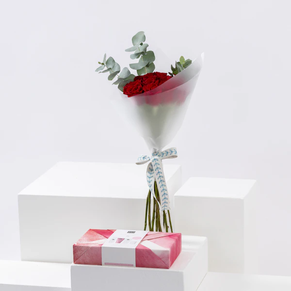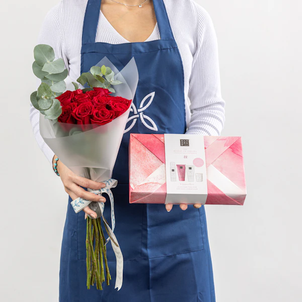 Experience the art of indulgence with 'The Ritual of Sakura Renewing Treat' - a curated delight for the senses. Immerse yourself in the gentle embrace of our foaming shower gel, where each luxurious bubble is a ritual of renewal. Ignite the ambiance with the delicate fragrance of our scented candle, filling the air with serenity. Pamper your skin with the velvety touch of body cream and the rejuvenating exfoliation of our body scrub. To complement this enchanting experience, embrace the beauty of love with a bouquet of vibrant red roses and fresh green eucalyptus, elegantly wrapped in white. Elevate your Valentine's Day with twelve blooms, each a testament to love's timeless charm.